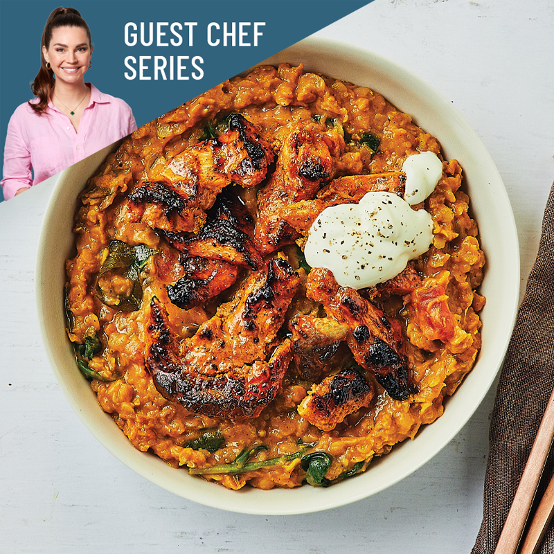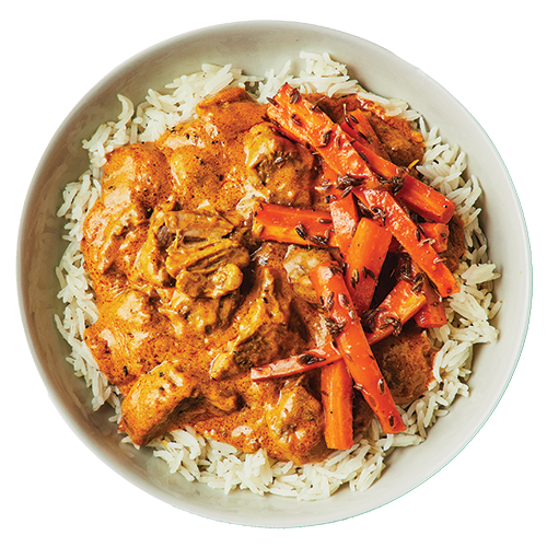 An aromatic, mildly spiced lamb curry enriched with creamy yoghurt, served with honey-cumin glazed carrots and a side of steamed basmati rice.
