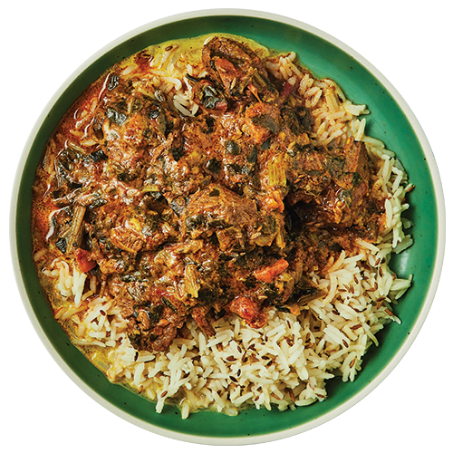 Tender braised lamb pieces, aromatic flavours cooked in a spinach sauce & served with cumin rice.