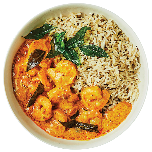 A mild southern Indian prawn curry with fragrant coconut rice.